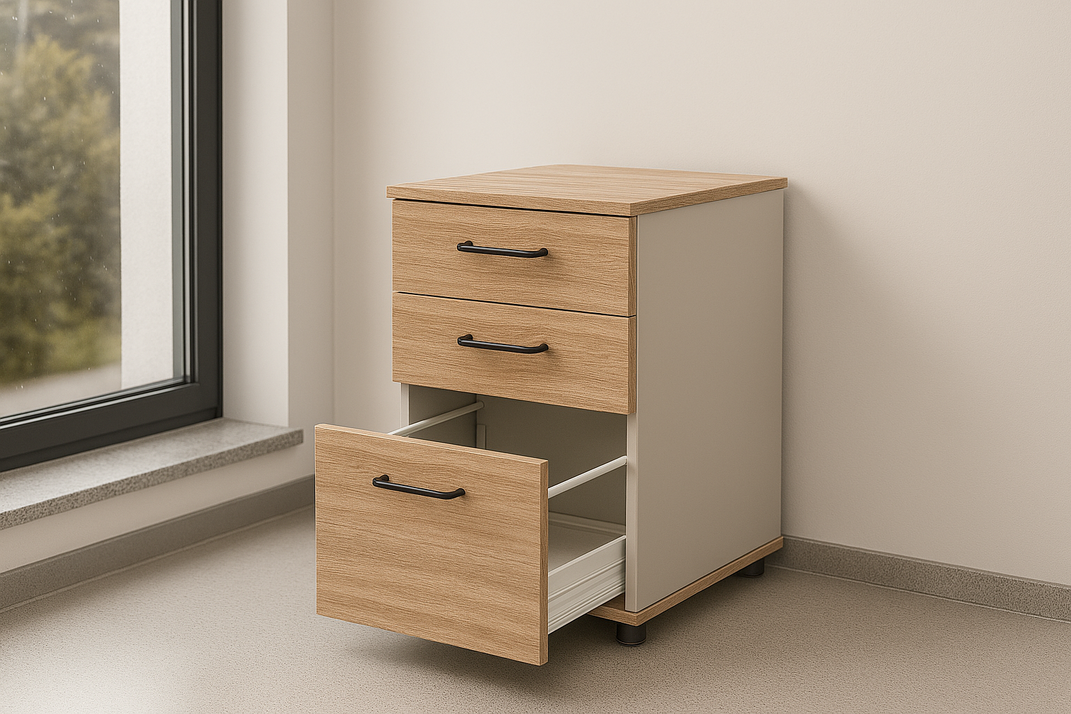 – Komodas bei stalčių blokus – patogiam daiktų organizavimui prie darbo vietos ar bendroje erdvėje.