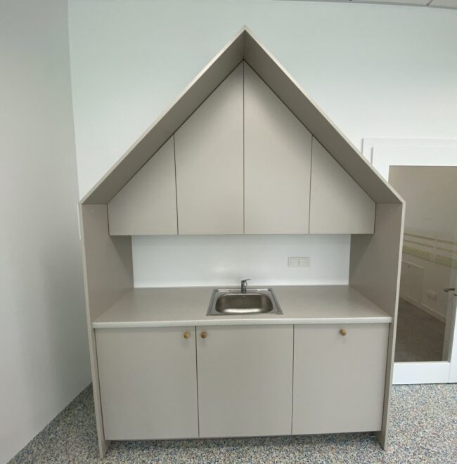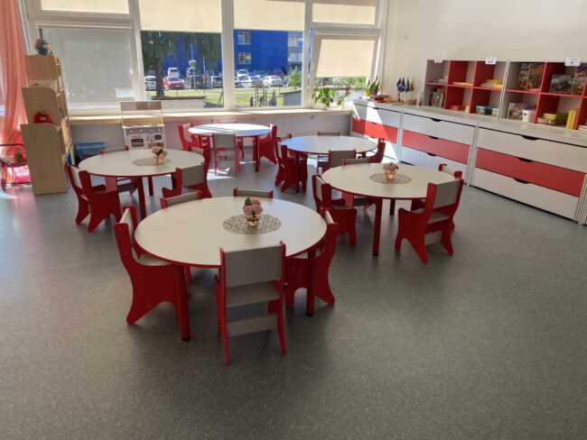 Lovytės: Trijų aukštų su stogu, frezutomis rankenomis Korpusas LMDP pilka 18mm Fasadai LMDP pilka 18mm + LMDP raudona 18mm Fanerinės kėdutės 1-2-3 dydžio korpusas LMDP 18mm, spalva pilka Fanera 10mm, raudona Stalai reguliuojamo aukšęio Stalviršis LMDP 18mm, spalva pilka PVC briauna raudona Metalinis rėmas D50mm ir 40×20 sąryšiai Dažyta milteliniu būdu spalva raudona