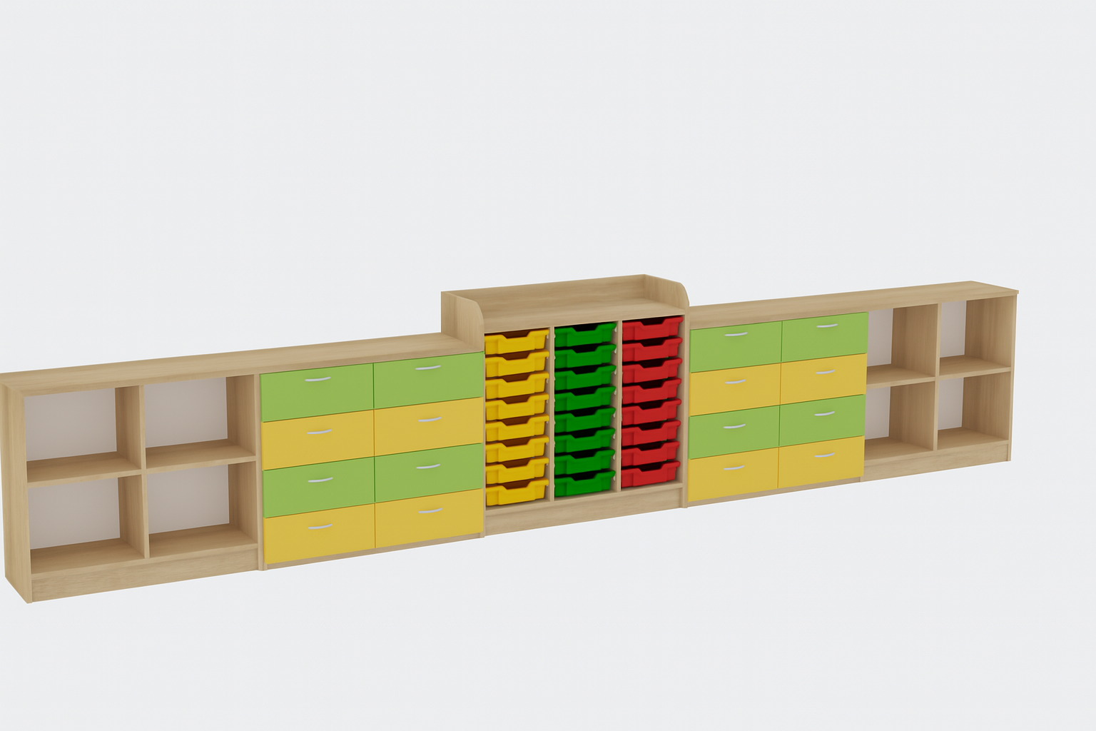 Penkių dalių darželio sekcija su 16 stalčių ir 27 dėžutėmis.